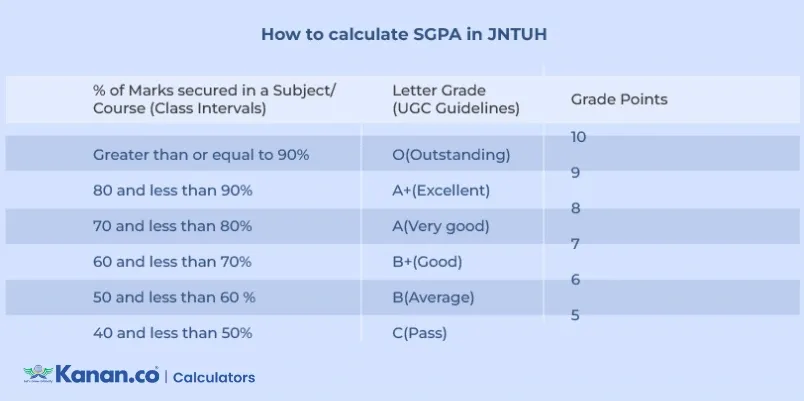Jawaharlal Nehru Technological University, Hyderabad, uses an absolute 10-point grade system to indicate the student's performance in a semester. The table below will showcase the percentage of marks obtained, corresponding grades, and their Grade Points according to the UGC guidelines.